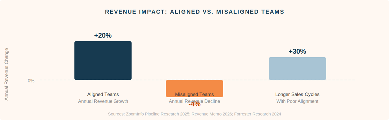 Companies with strong sales and marketing alignment achieve 20% higher annual revenue growth. Companies with poor alignment see an average 4% annual revenue decline. Highly aligned companies grow 19% faster and are 15% more profitable than their misaligned peers.