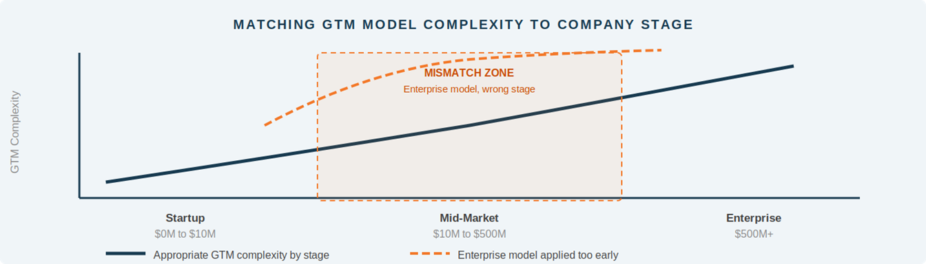 The mid-market occupies a structurally awkward position. Companies at this stage are too large to operate with the informal, founder-led commercial instincts that carried them through early growth. They are too small, and often too thinly staffed, to execute the full-scale commercial infrastructure that enterprise companies deploy. The GTM approaches that work at both ends of the spectrum often fail in the middle.