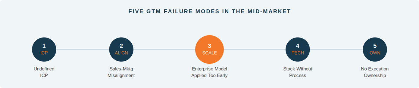 The five GTM failure modes that consistently stall revenue in the $10M to $500M range.